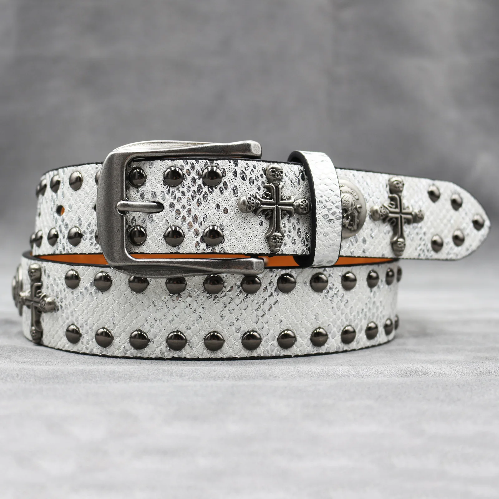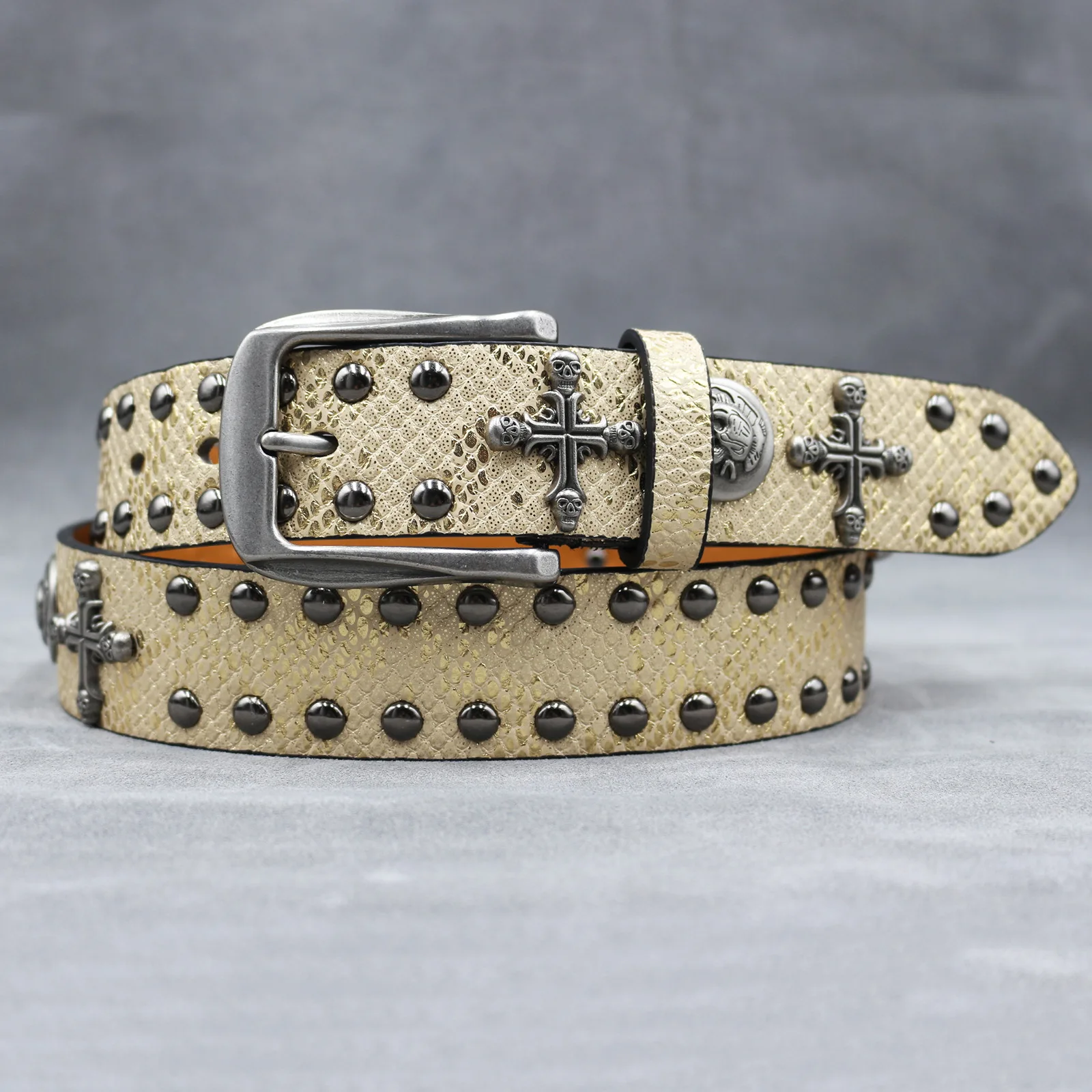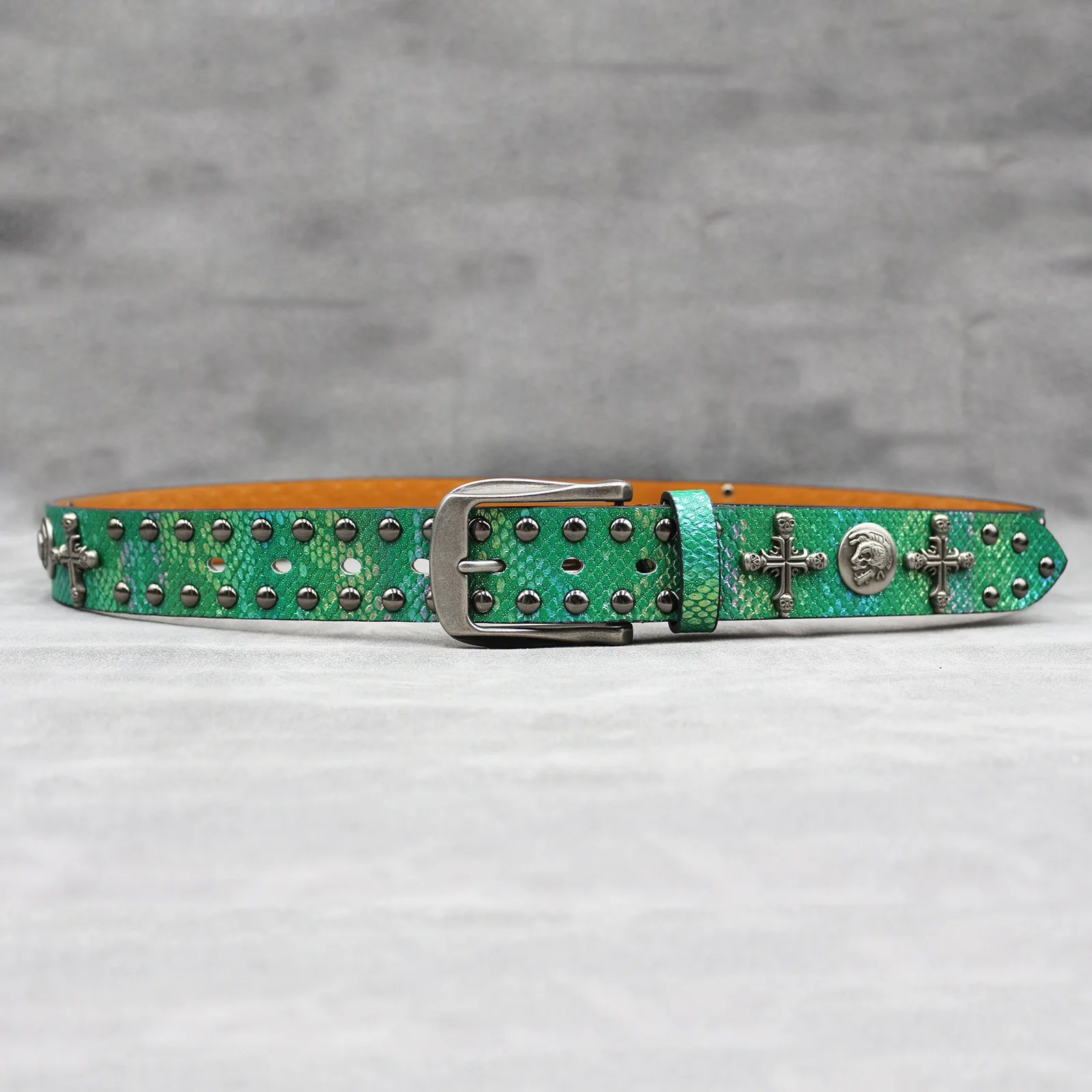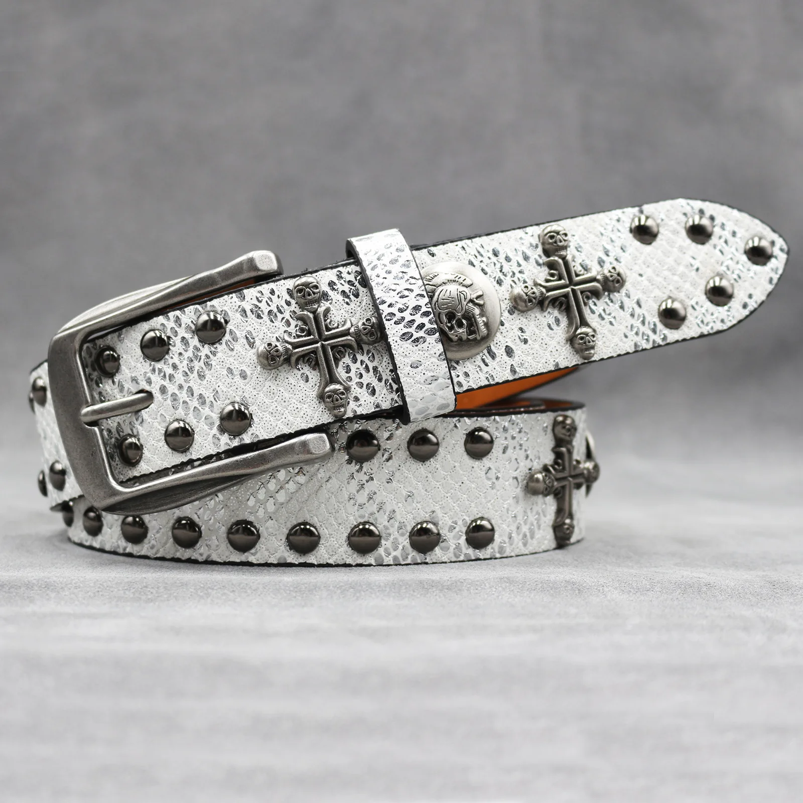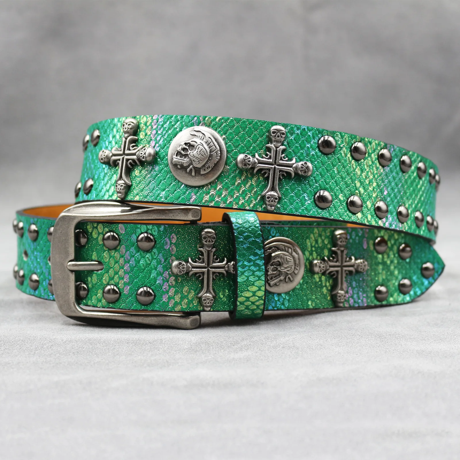 Mit seinem Punk-inspirierten Stil und dem Schlangenhaut-Aufdruck ist dieser Gürtel vielseitig genug, um eine Vielzahl von Looks zu ergänzen, von lässig bis formell.