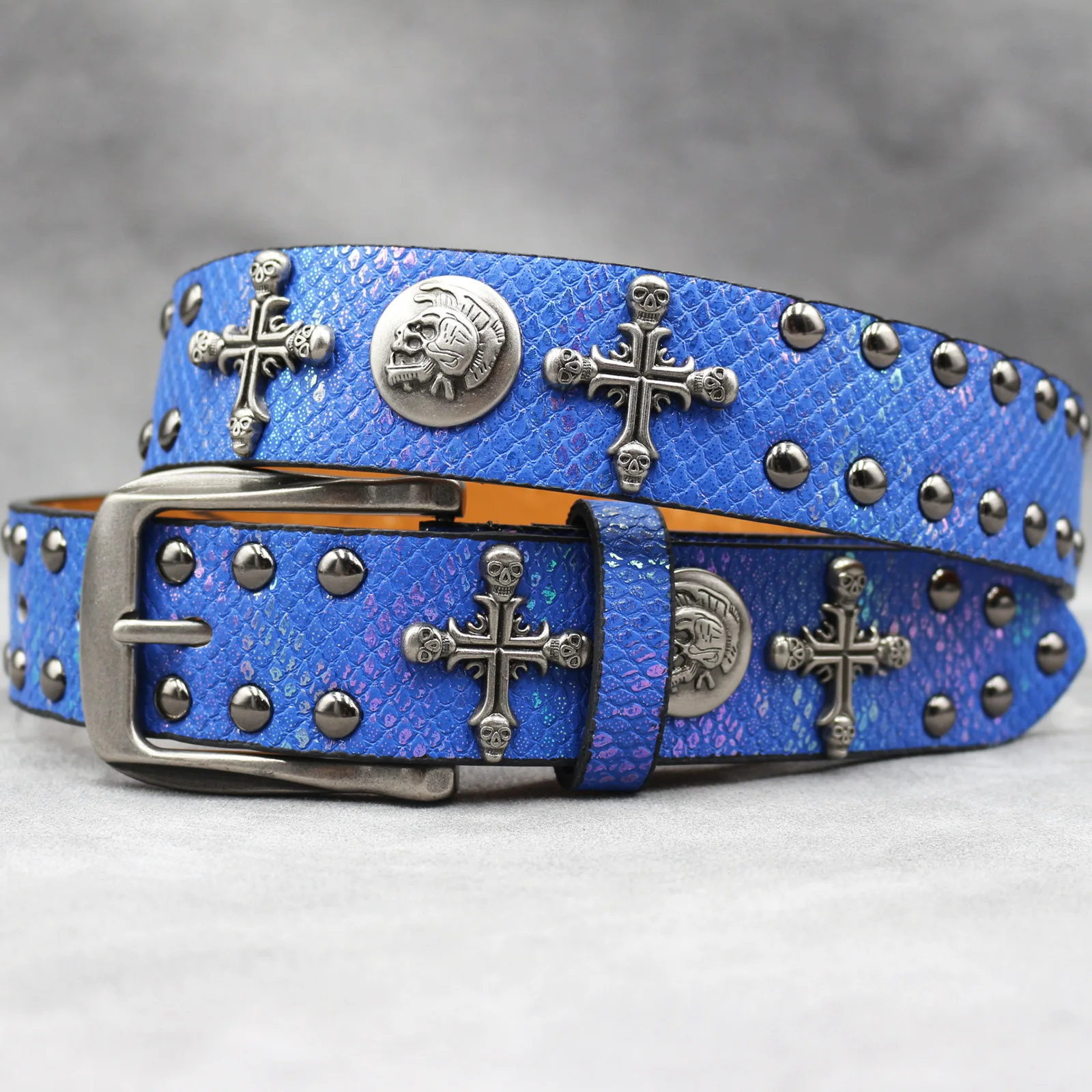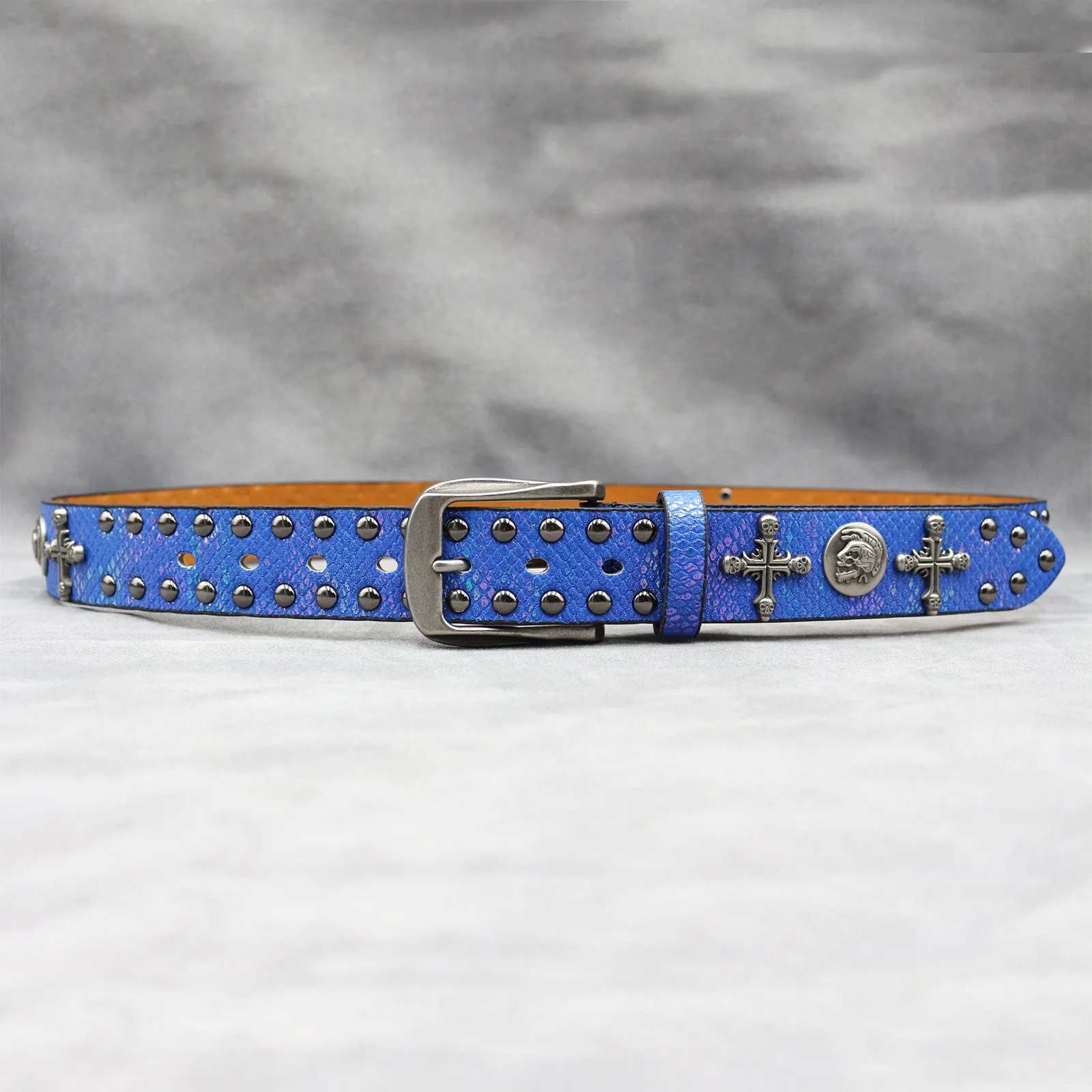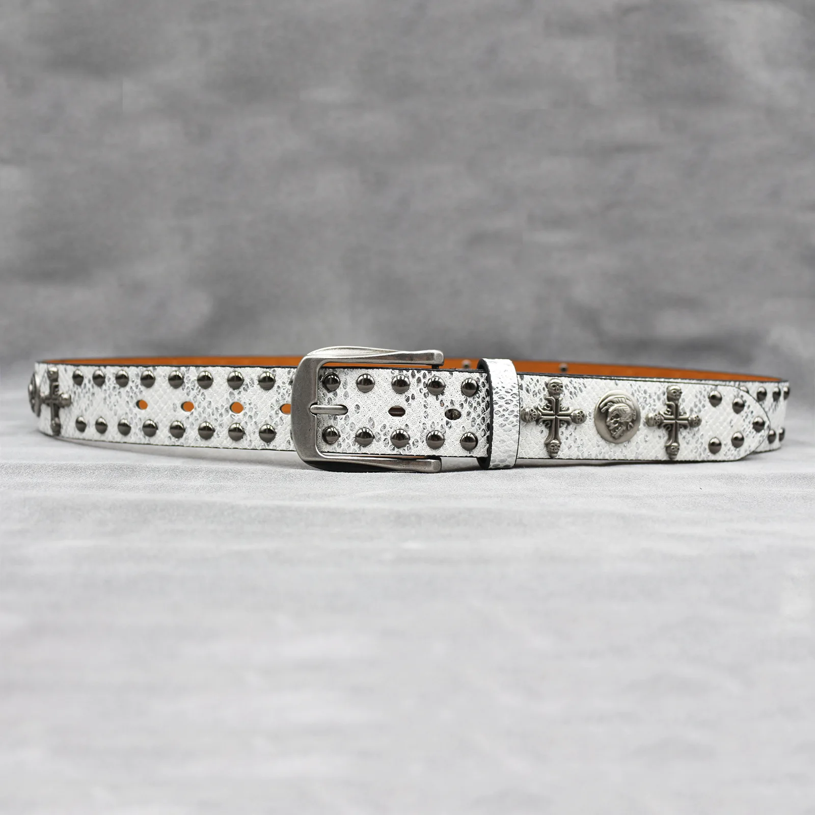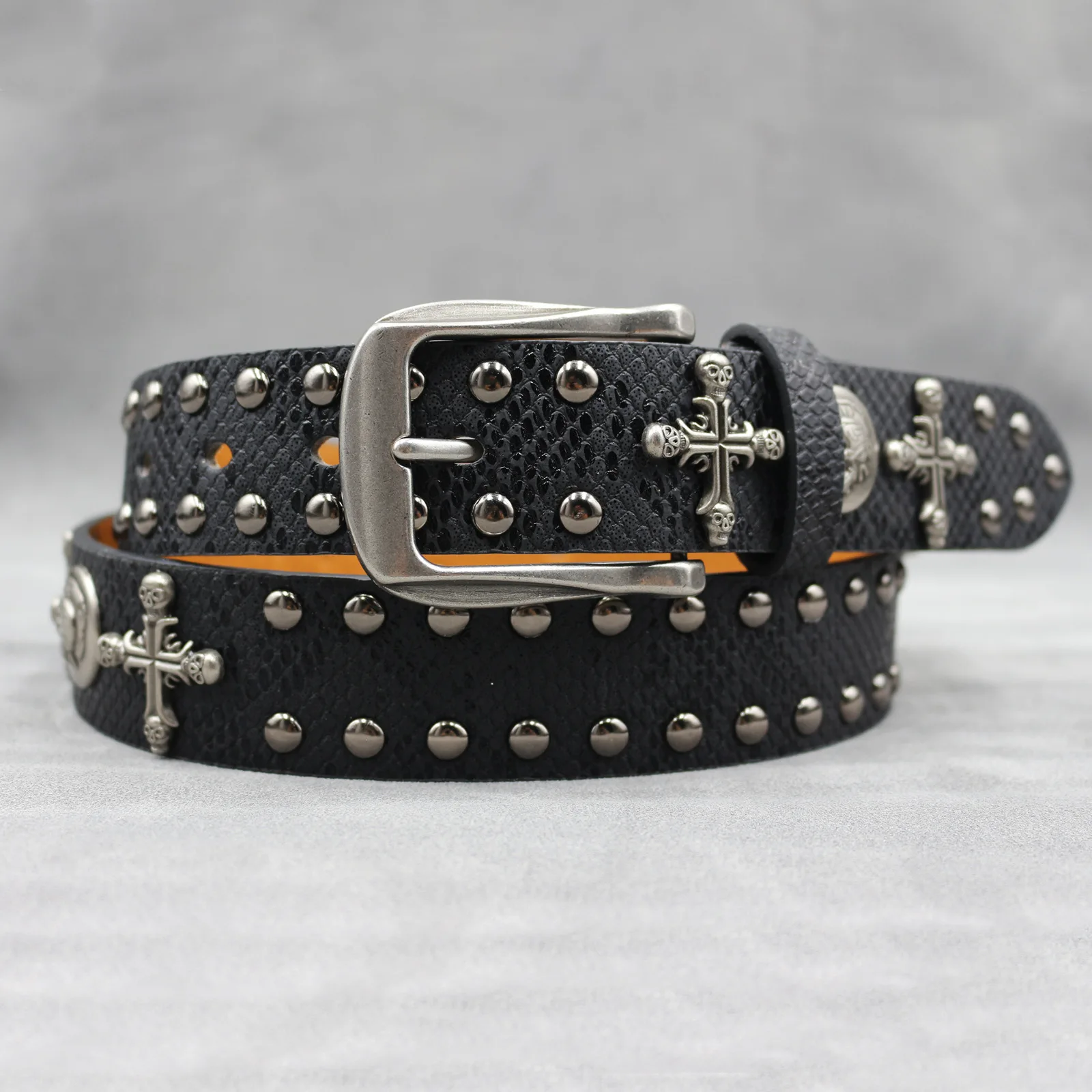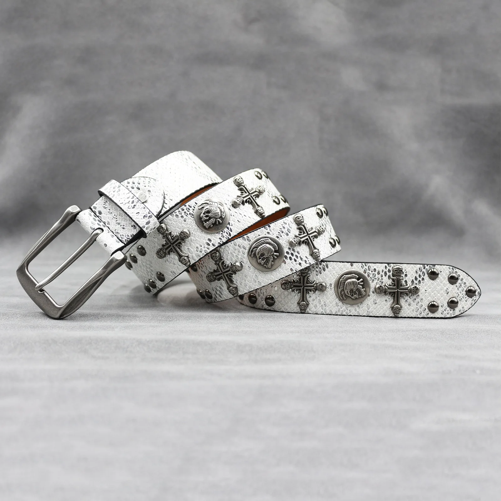 Mit seinem Punk-inspirierten Stil und dem Schlangenhaut-Aufdruck ist dieser Gürtel vielseitig genug, um eine Vielzahl von Looks zu ergänzen, von lässig bis formell.